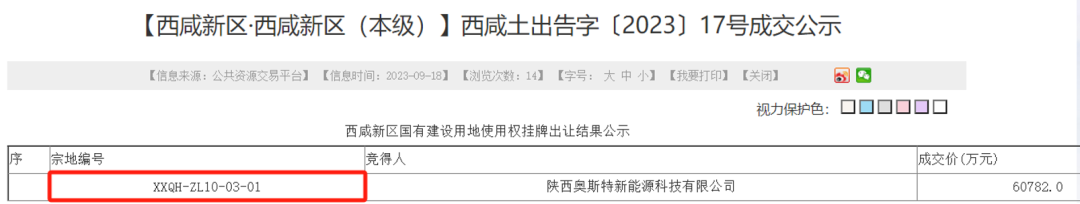9月18日,陕西省各人资源交往中心官网暴露,一宗西咸新区国有成立用地使用权挂牌出让,竞得东说念主为陕西奥斯特新能源科技有限公司,成交价约6.08亿元。