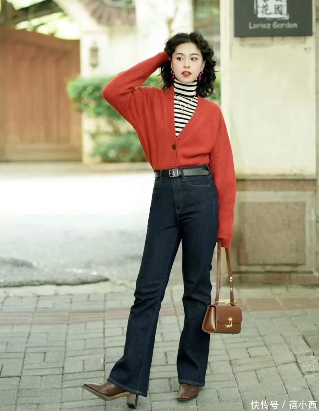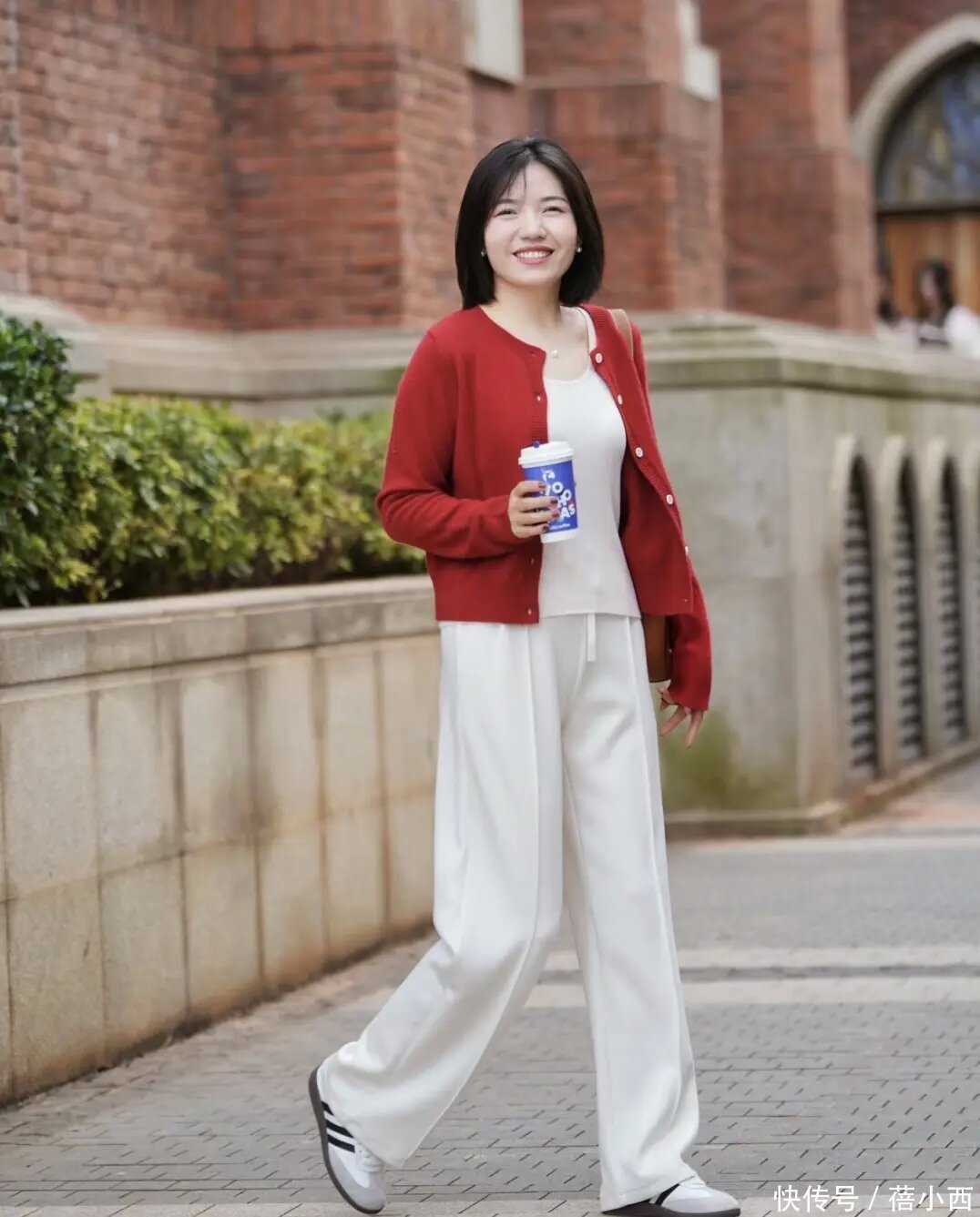 毛衣开衫最稳健用来叠穿了,只需在内部搭配一件浅陋的打底衫,就能让咱们的造型变得有线索,像这么一件红色的毛衣开衫配上白色T恤,浅陋娴雅,大气。