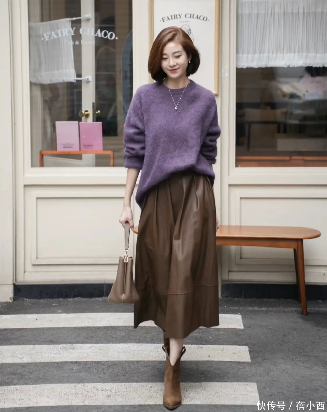 秋冬时节千万不要小器与给我方选购一件悦目娴雅的毛衣,在身手范围之内,你要接受一件质感最好,表情最好的毛衣,而这么的紫色毛衣穿上身不仅会以为很和睦恬逸,同期也显得先锋度爆棚,搭配着棕色的皮革半身裙,更是将复旧的气味演绎的至极强烈。
