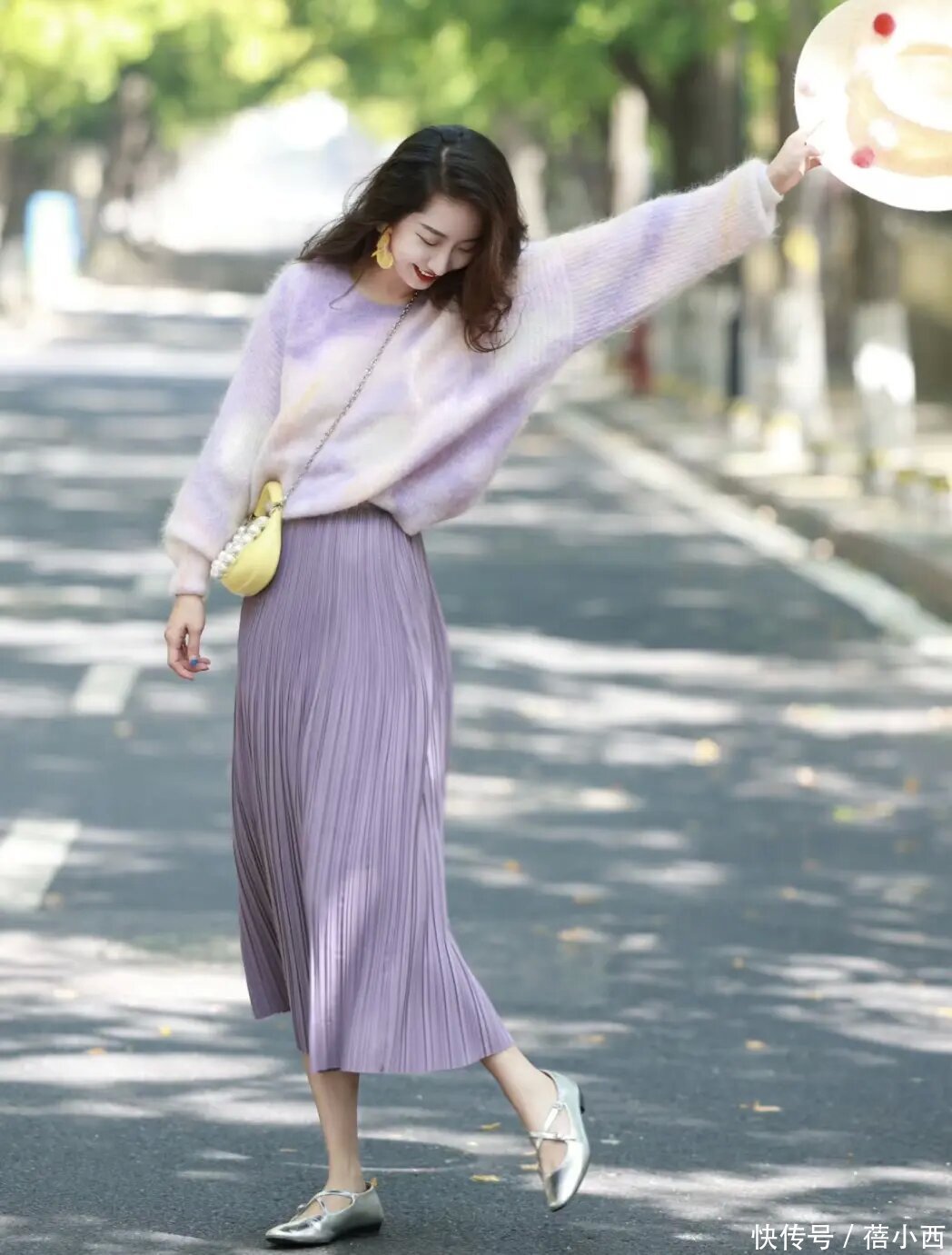 紫色的印花毛衣和紫色的百褶长裙搭配,这么一组氛围感饱和的色调涌现注解出了属于冬日的韵味。穿上一抹亮丽的紫色,散步于街头,扫数这个词东谈主王人散漫出一种舒心且恬逸的气味。