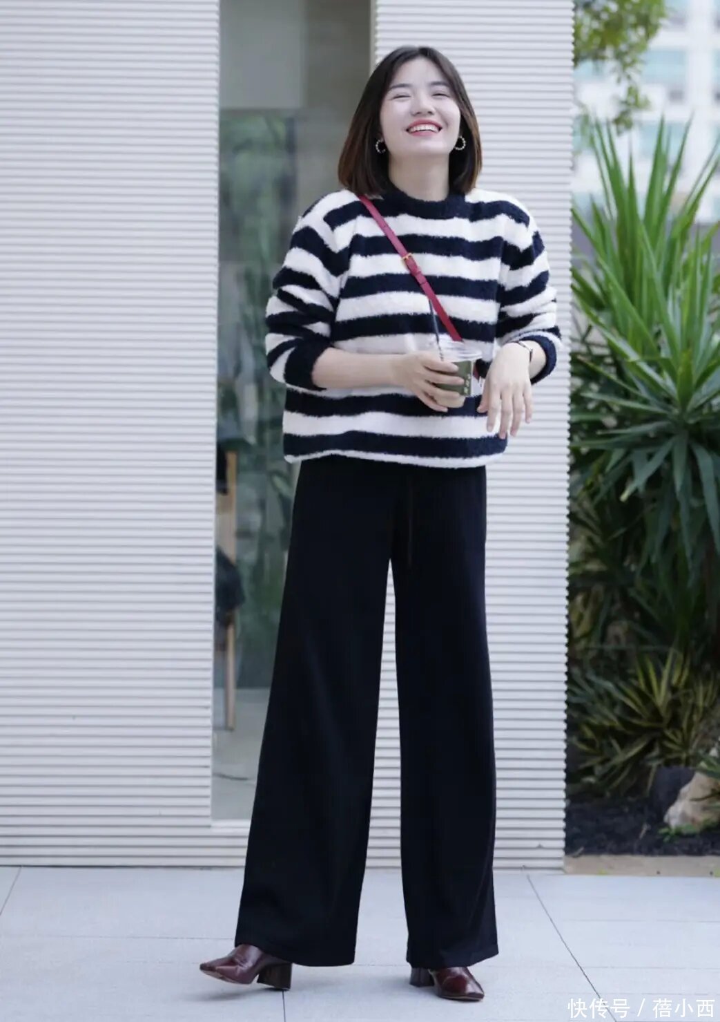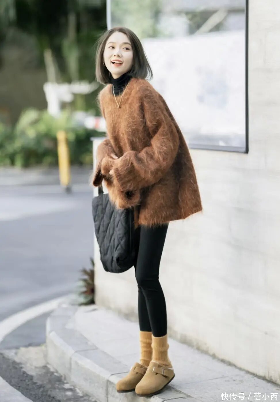 宽松的毛衣穿上身,下半身只需搭配一条修身的打底裤,便或者让咱们的纤细双腿展露无遗,就像这么一件宽松的棕色毛衣和玄色打底裤的聚拢,互相合作,结束了显瘦增高诡计。